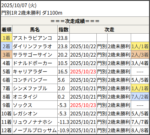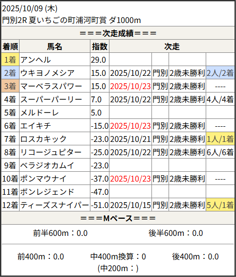 2025/10/23 門別1R 2歳未勝利:結果