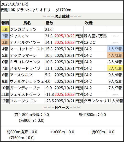 2025/10/23 門別10R グランシャリオドリー:結果