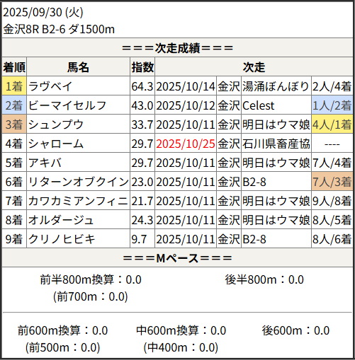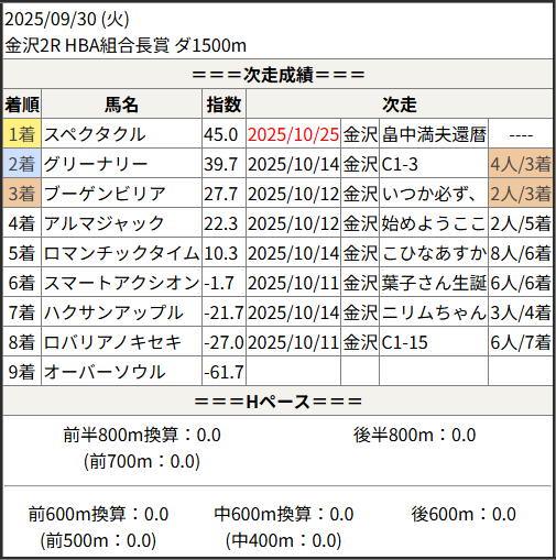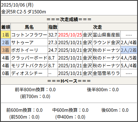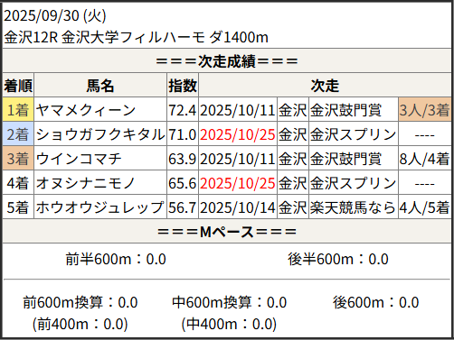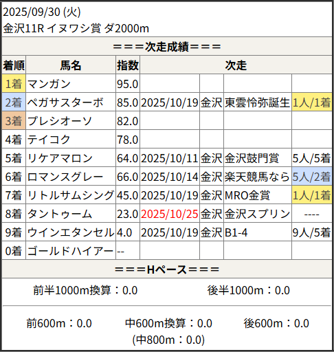 2025/10/25 金沢9R 畠中満夫還暦記念:結果