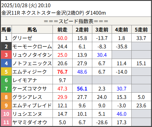 2025/10/28 スピード指数表