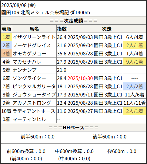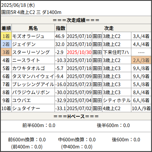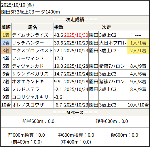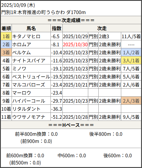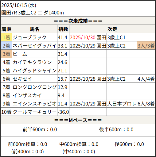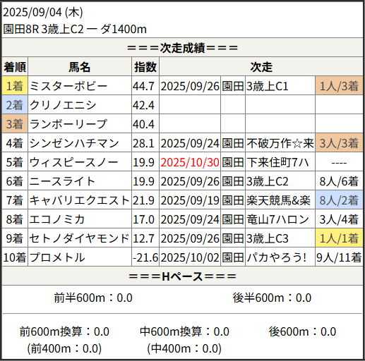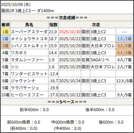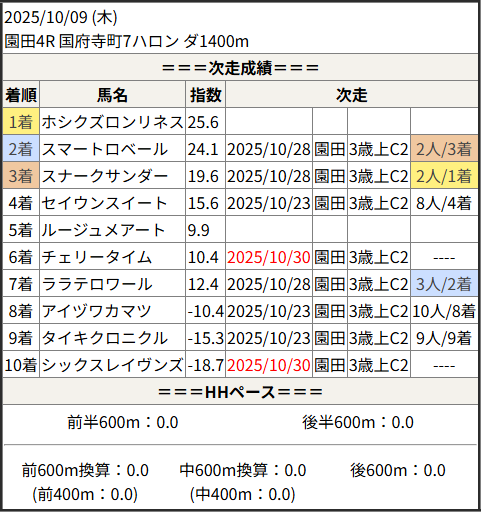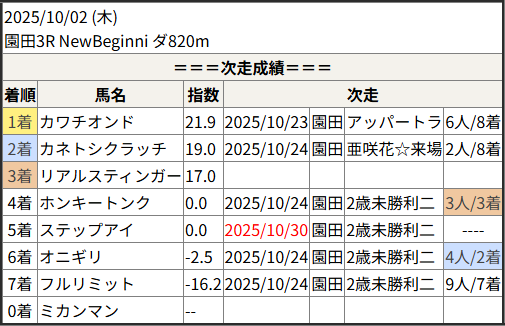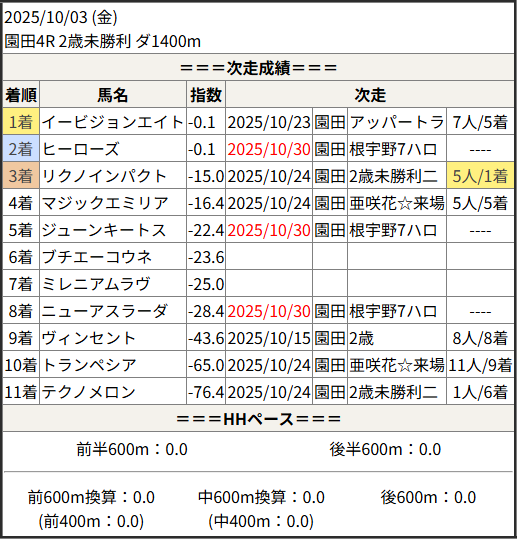 2025/10/30 園田4R 根宇野7ハロン2歳未:結果