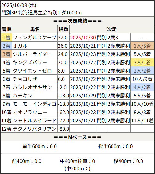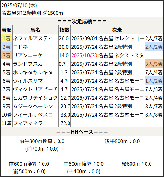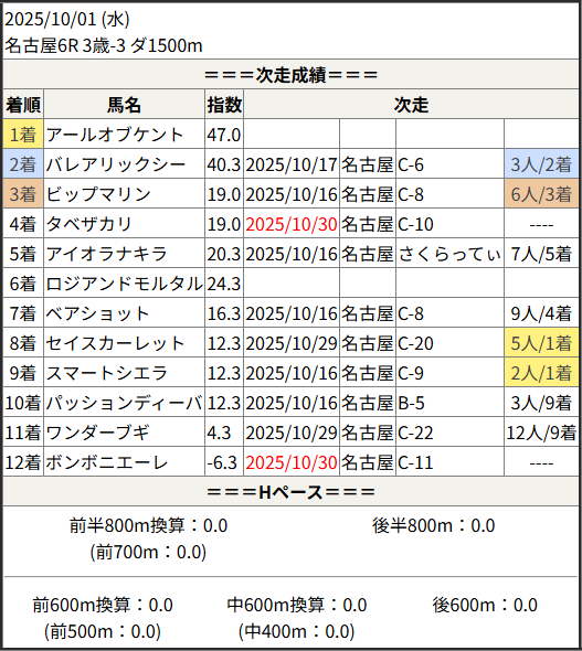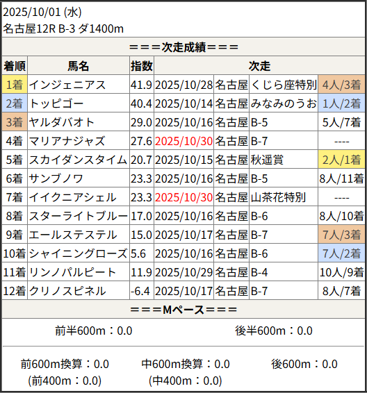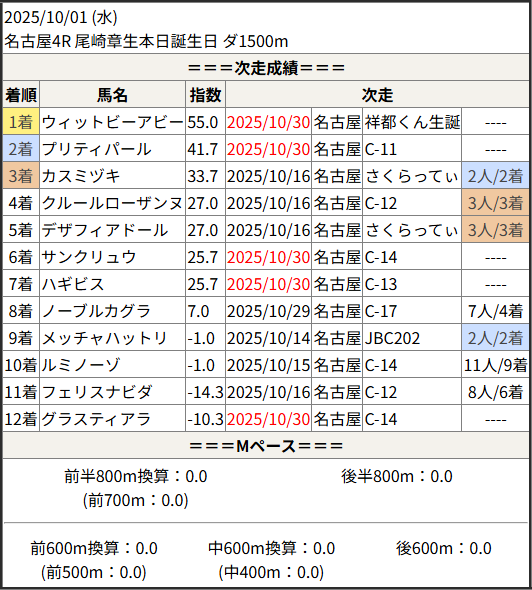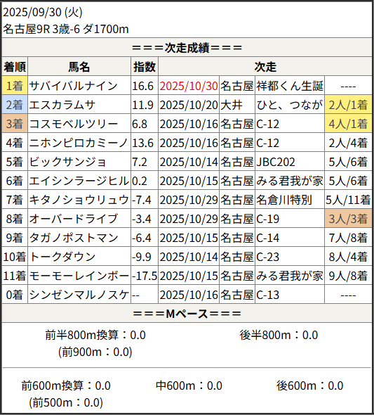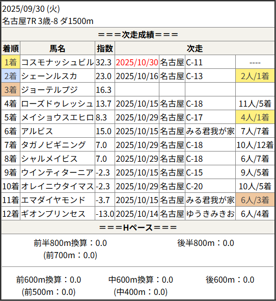 2025/10/30 名古屋11R ネクストスター名古屋:結果