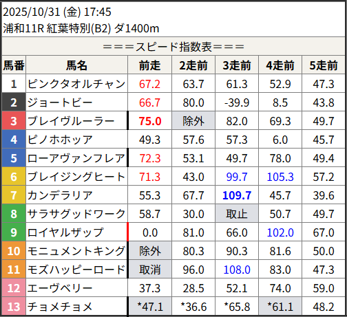 Home / 予想データ / 2025/10/31 スピード指数表スピード指数予想データ2025/10/31 スピード指数表による shunrai コメントはまだありません2025年10月30日 21:03 ※見解・買い目はこちらを参照ください。 浦和 名古屋 共有: クリックして X で共有 (新しいウィンドウで開きます) X クリックして友達にメールでリンクを送信 (新しいウィンドウで開きます) メールアドレス Facebook で共有するにはクリックしてください (新しいウィンドウで開きます) Facebook いいね:いいね 読み込み中…Share ArticlePrevious Article2025/10/30 エーデルワイス賞 馬連・3連複・3連単◎○▲ 80,500円🎯Next Article2025/10/31 次走好走馬の目立つ組出身shunraiRelated Posts 2025/11/15 スピード指数表 2025年11月14日 2025/11/14 スピード指数表 2025年11月13日 2025/11/13 スピード指数表 2025年11月12日コメントを残す コメントをキャンセルメールアドレスが公開されることはありません。 ※ が付いている欄は必須項目ですコメント名前 メール サイト 次回のコメントで使用するためブラウザーに自分の名前、メールアドレス、サイトを保存する。 Δ