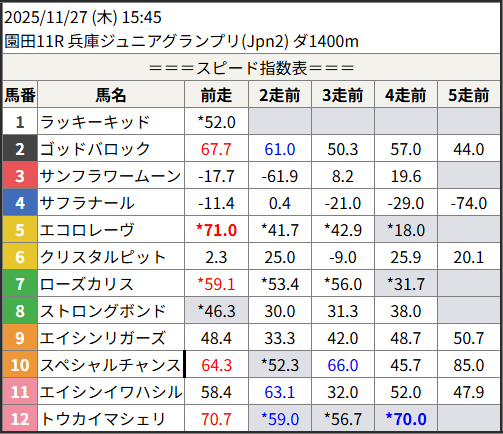 Home / 予想データ / 2025/11/27 スピード指数表スピード指数予想データ2025/11/27 スピード指数表による shunrai コメントはまだありません2025年11月26日 21:09 ※見解・買い目はこちらを参照ください。 浦和 笠松 園田 共有: クリックして X で共有 (新しいウィンドウで開きます) X クリックして友達にメールでリンクを送信 (新しいウィンドウで開きます) メールアドレス Facebook で共有するにはクリックしてください (新しいウィンドウで開きます) Facebook いいね:いいね 読み込み中…Share ArticlePrevious Article2025/11/26 名古屋12R 3連複・3連単◎▲注 17,400円🎯Next Article2025/11/27 次走好走馬の目立つ組出身shunraiRelated Posts 2025/12/29 スピード指数表 2025年12月28日 2025/12/28 スピード指数表 2025年12月27日 2025/12/27 スピード指数表 2025年12月26日コメントを残す コメントをキャンセルメールアドレスが公開されることはありません。 ※ が付いている欄は必須項目ですコメント名前 メール サイト 次回のコメントで使用するためブラウザーに自分の名前、メールアドレス、サイトを保存する。 Δ