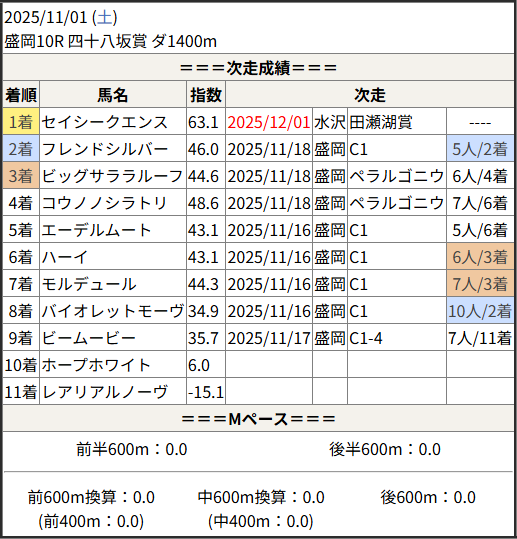 2025/12/01 水沢11R 田瀬湖賞:結果