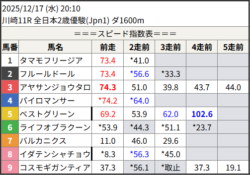 Home / 予想データ / 2025/12/17 スピード指数表スピード指数予想データ2025/12/17 スピード指数表による shunrai コメントはまだありません2025年12月17日 03:54 ※見解・買い目はこちらを参照ください。 川崎 笠松 園田 共有: クリックして X で共有 (新しいウィンドウで開きます) X クリックして友達にメールでリンクを送信 (新しいウィンドウで開きます) メールアドレス Facebook で共有するにはクリックしてください (新しいウィンドウで開きます) Facebook いいね:いいね 読み込み中…Share ArticlePrevious Article2025/12/16 次走好走馬の目立つ組出身Next Article2025/12/17 次走好走馬の目立つ組出身shunraiRelated Posts 2025/12/29 スピード指数表 2025年12月28日 2025/12/28 スピード指数表 2025年12月27日 2025/12/27 スピード指数表 2025年12月26日コメントを残す コメントをキャンセルメールアドレスが公開されることはありません。 ※ が付いている欄は必須項目ですコメント名前 メール サイト 次回のコメントで使用するためブラウザーに自分の名前、メールアドレス、サイトを保存する。 Δ