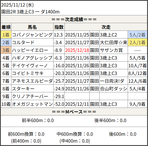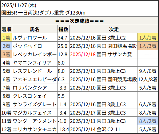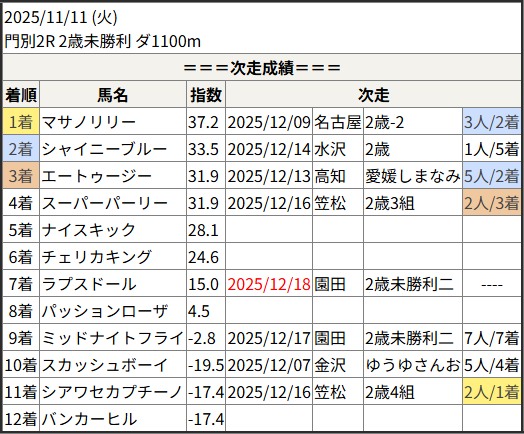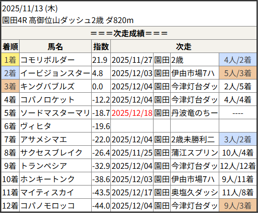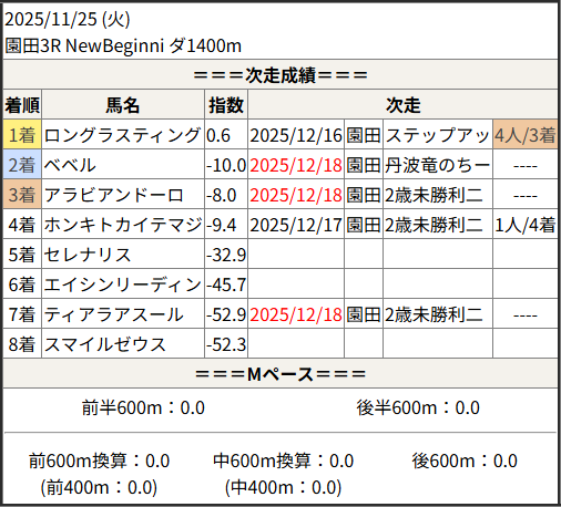 2025/12/18 園田3R 2歳未勝利二:結果