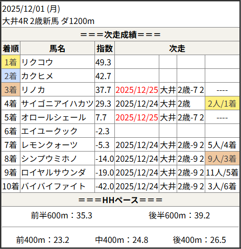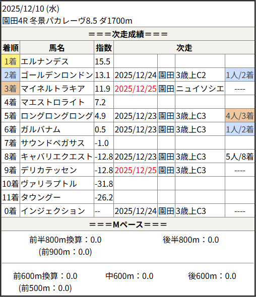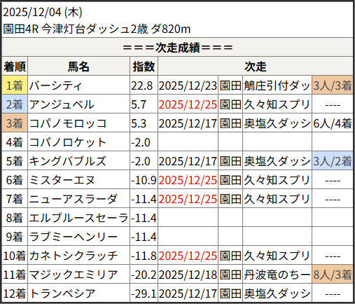 2025/12/25 園田4R 久々知スプリント2歳:結果