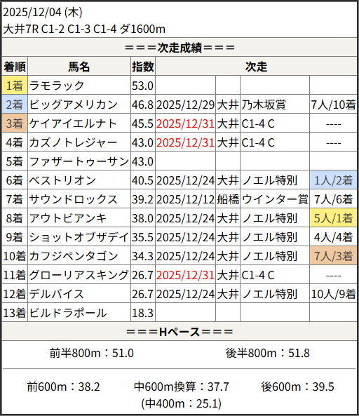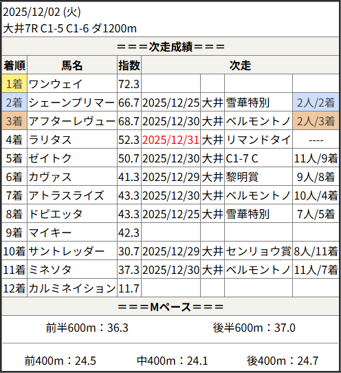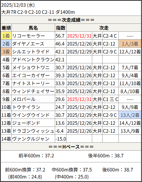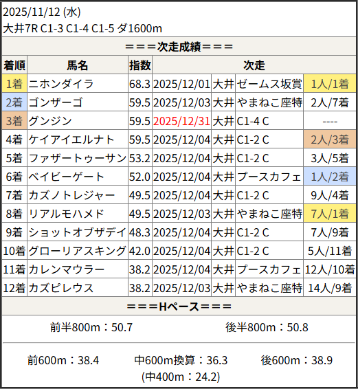 2025/12/31 大井7R C1 三 C2 二:結果