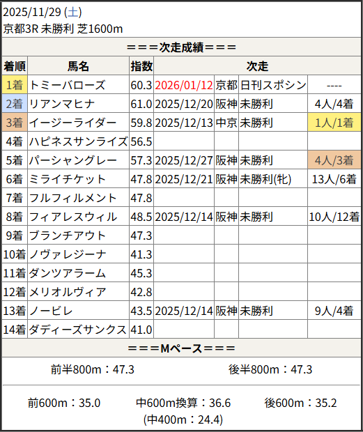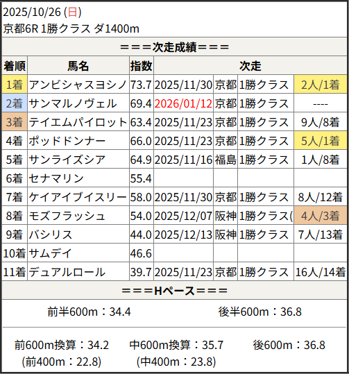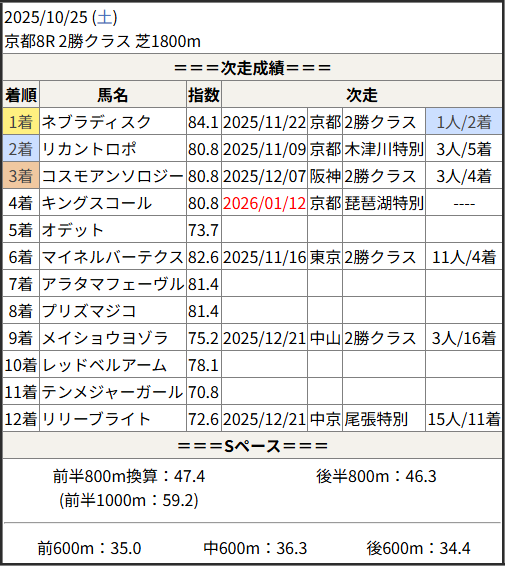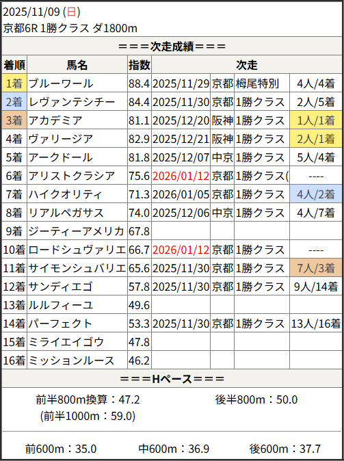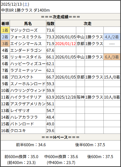 2026/01/12 京都6R 1勝クラス(牝):結果