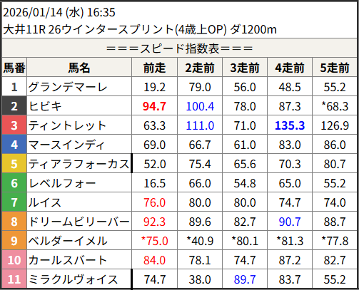 Home / 予想データ / 2026/01/14 スピード指数表スピード指数予想データ2026/01/14 スピード指数表による shunrai コメントはまだありません2026年1月13日 20:56 ※見解・買い目はこちらを参照ください。 大井 名古屋 園田 共有: X で共有 (新しいウィンドウで開きます) X 友達にメールでリンクを送信 (新しいウィンドウで開きます) メールアドレス Facebook で共有 (新しいウィンドウで開きます) Facebook いいね:いいね 読み込み中…Share ArticlePrevious Article2026/01/13 名古屋9R 3連単◎○△ 14,800円🎯Next Article2026/01/14 次走好走馬の目立つ組出身shunraiRelated Posts 2026/02/13 スピード指数表 2026年2月12日 2026/02/12 スピード指数表 2026年2月12日 2026/02/11 スピード指数表 2026年2月11日コメントを残す コメントをキャンセルメールアドレスが公開されることはありません。 ※ が付いている欄は必須項目ですコメント名前 メール サイト 次回のコメントで使用するためブラウザーに自分の名前、メールアドレス、サイトを保存する。 Δ