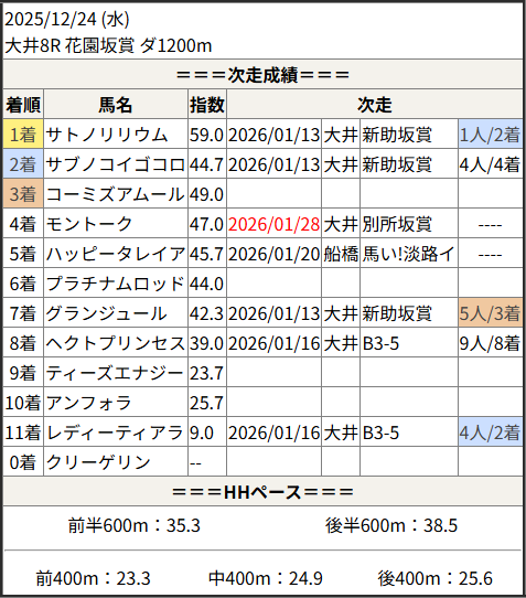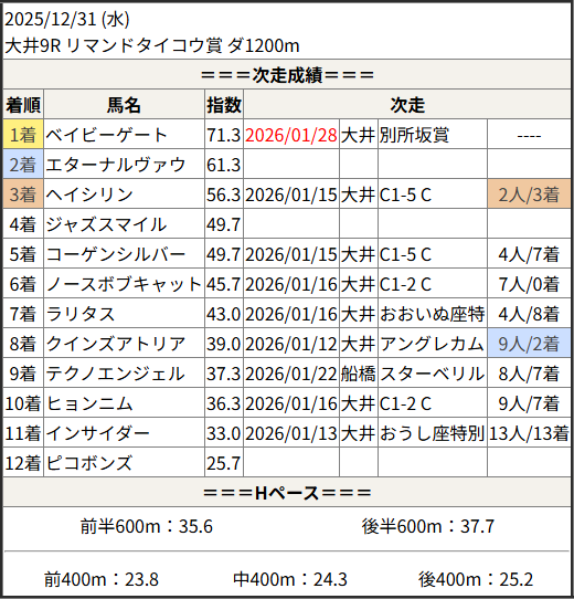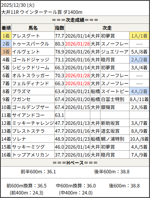 2026/01/28 大井12R スノーフレーク賞:結果