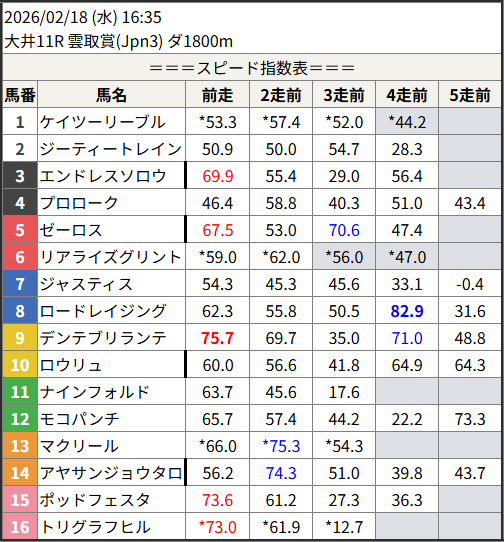 Home / 予想データ / 2026/02/18 スピード指数表