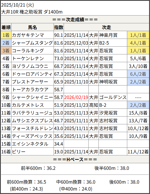 2026/02/19 大井11R ゴールデンステッキ賞:結果