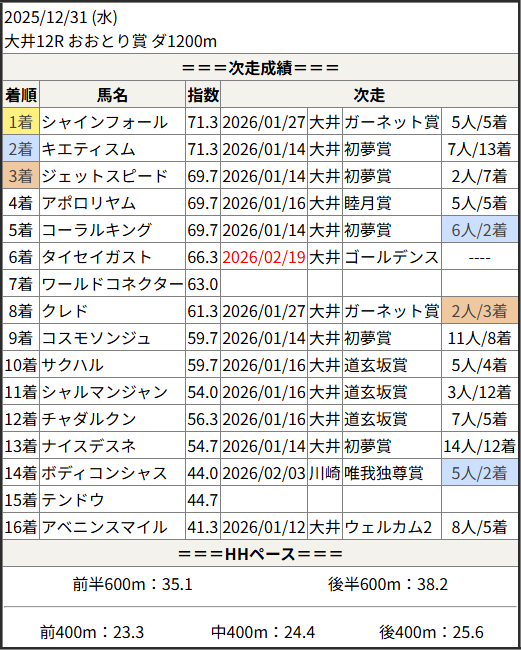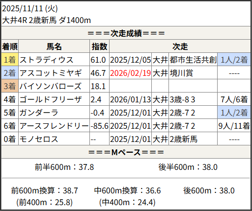 2026/02/19 大井4R 境川賞:結果