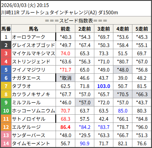 Home / 予想データ / 2026/03/03 スピード指数表スピード指数予想データ2026/03/03 スピード指数表による shunrai コメントはまだありません2026年3月3日 06:40 ※見解・買い目はこちらを参照ください。 川崎 笠松 姫路 高知 共有: X で共有 (新しいウィンドウで開きます) X 友達にメールでリンクを送信 (新しいウィンドウで開きます) メールアドレス Facebook で共有 (新しいウィンドウで開きます) Facebook いいね:いいね 読み込み中…Share ArticlePrevious Article2026/03/02 スピード指数表shunraiRelated Posts 2026/03/02 スピード指数表 2026年3月2日 2026/03/01 スピード指数表 2026年3月2日 2026/02/28 スピード指数表 2026年3月2日コメントを残す コメントをキャンセルメールアドレスが公開されることはありません。 ※ が付いている欄は必須項目ですコメント名前 メール サイト 次回のコメントで使用するためブラウザーに自分の名前、メールアドレス、サイトを保存する。 Δ