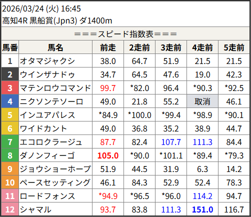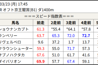 Home / 予想データ / 2026/03/24 スピード指数表スピード指数予想データ2026/03/24 スピード指数表による shunrai コメントはまだありません2026年3月23日 21:02 ※見解・買い目はこちらを参照ください。 水沢 大井 金沢 名古屋 園田 高知 共有: X で共有 (新しいウィンドウで開きます) X 友達にメールでリンクを送信 (新しいウィンドウで開きます) メールアドレス Facebook で共有 (新しいウィンドウで開きます) Facebook いいね:いいね 読み込み中…Share ArticlePrevious Article2026/03/23 高知ファイナル 3連複注○◎ 12,060円🎯shunraiRelated Posts 2026/03/23 スピード指数表 2026年3月22日 2026/03/22 スピード指数表 2026年3月21日 2026/03/21 スピード指数表 2026年3月20日コメントを残す コメントをキャンセルメールアドレスが公開されることはありません。 ※ が付いている欄は必須項目ですコメント名前 メール サイト 次回のコメントで使用するためブラウザーに自分の名前、メールアドレス、サイトを保存する。 Δ