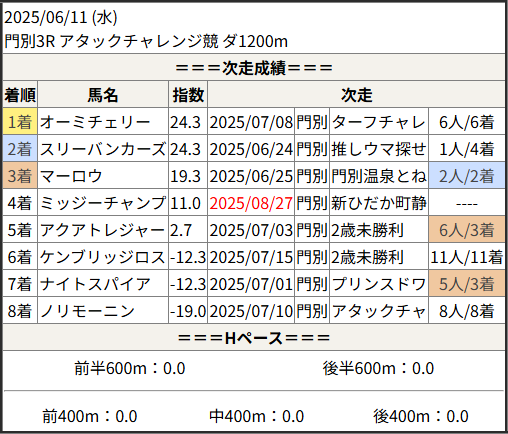 2025/08/27 門別4R アタックチャレンジ競:結果