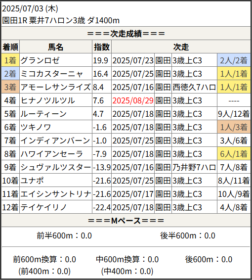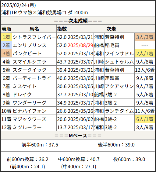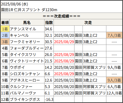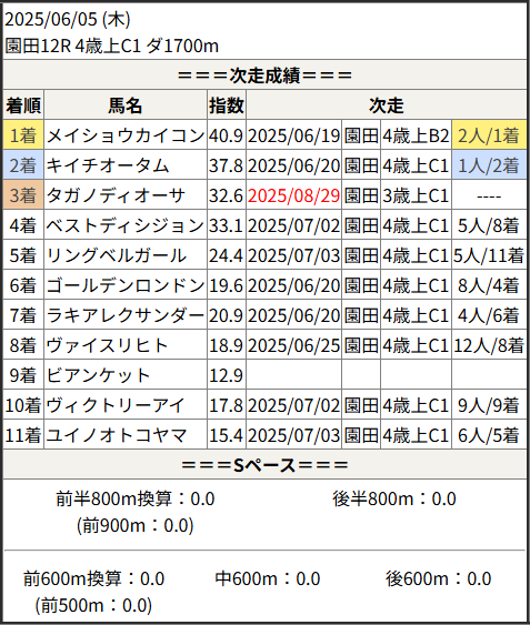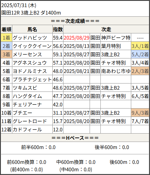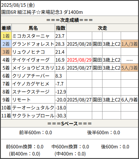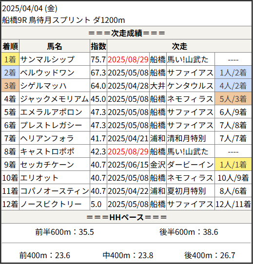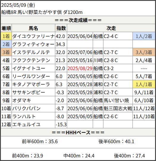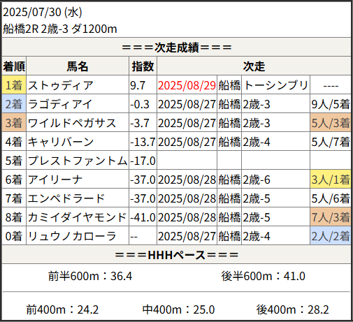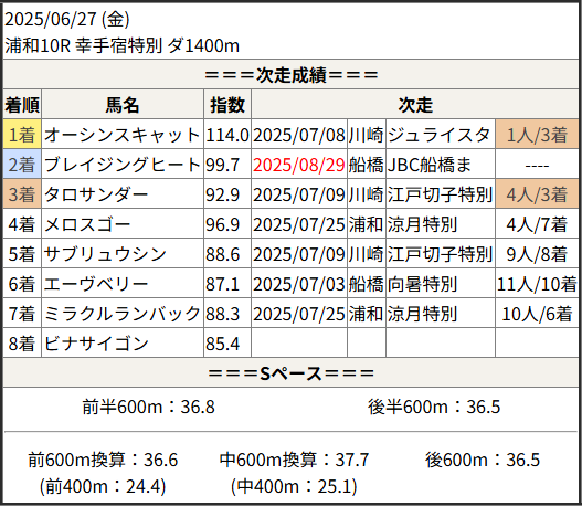 2025/08/29 船橋6R 稲毛賞:結果