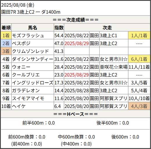 2025/08/29 園田10R 3歳上C1:結果