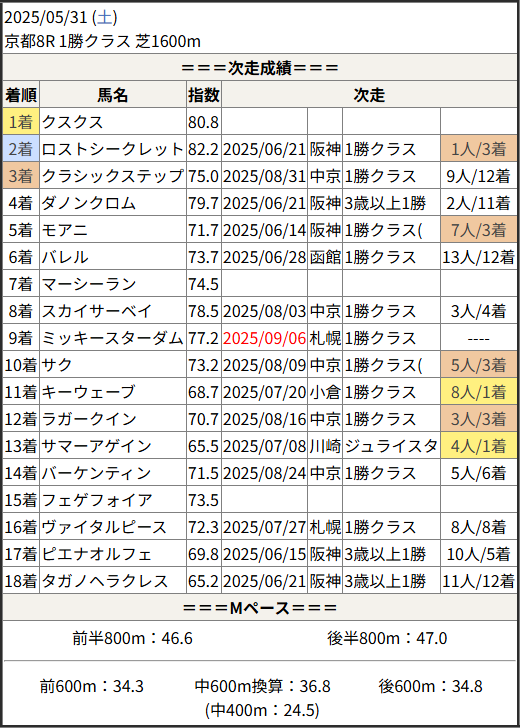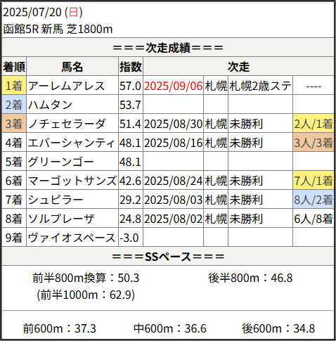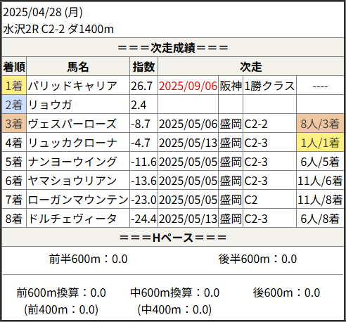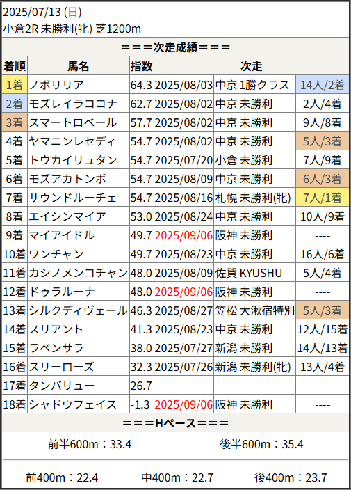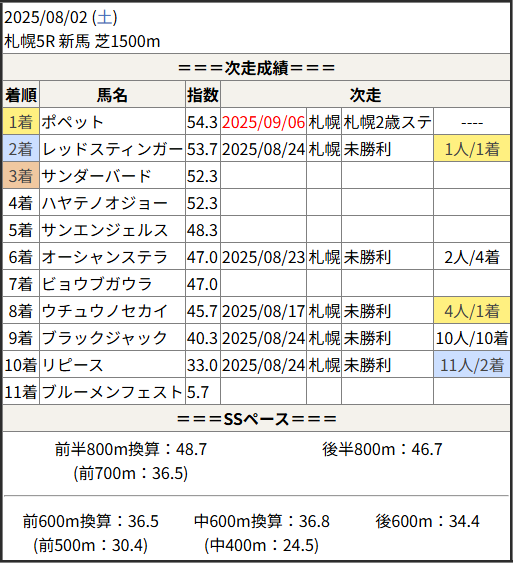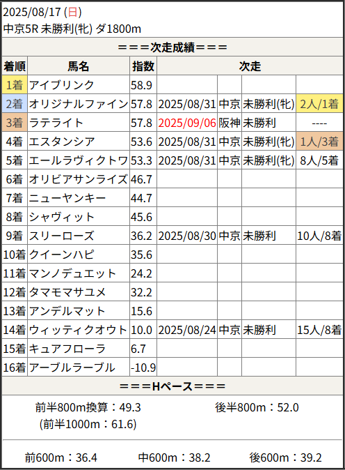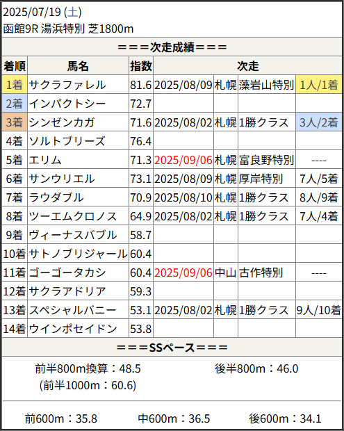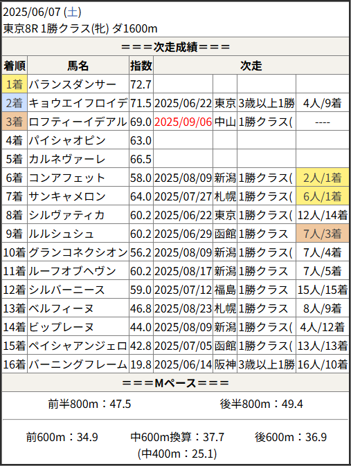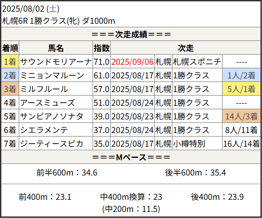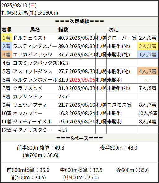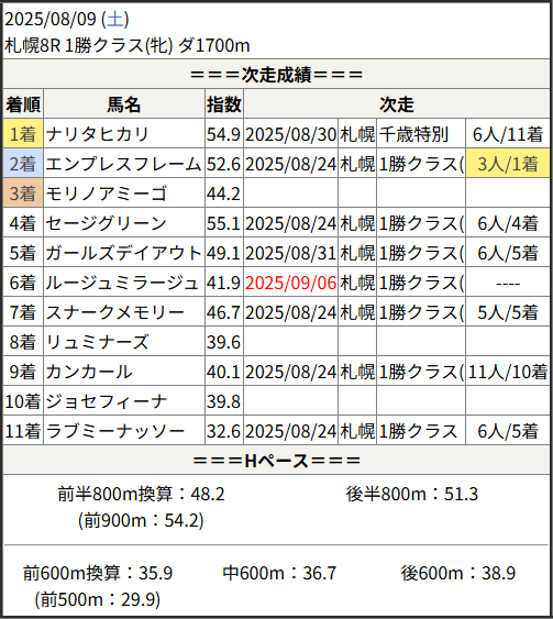 2025/09/06 札幌8R 1勝クラス(牝):結果