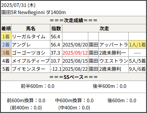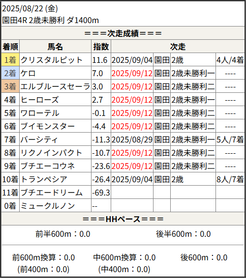 2025/09/12 園田4R 2歳未勝利一:結果