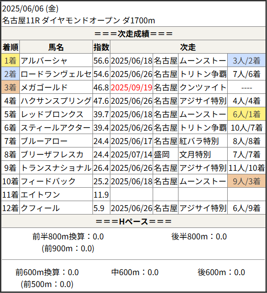 2025/09/19 名古屋11R クンツァイトオープン:結果