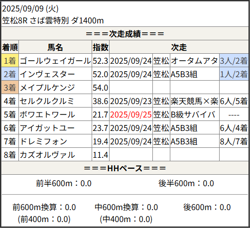 2025/09/25 門別8R ヘメロカリス特別:結果