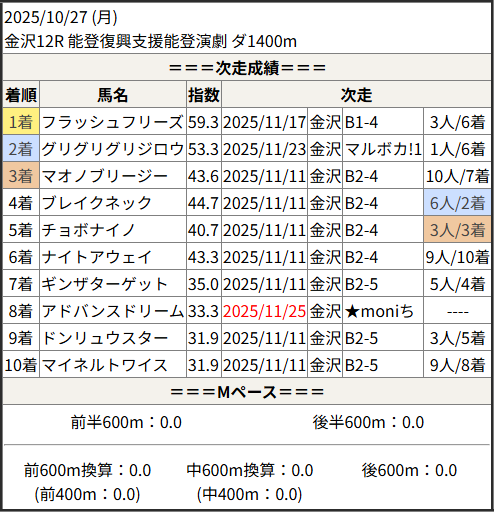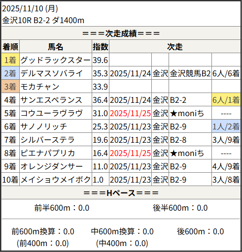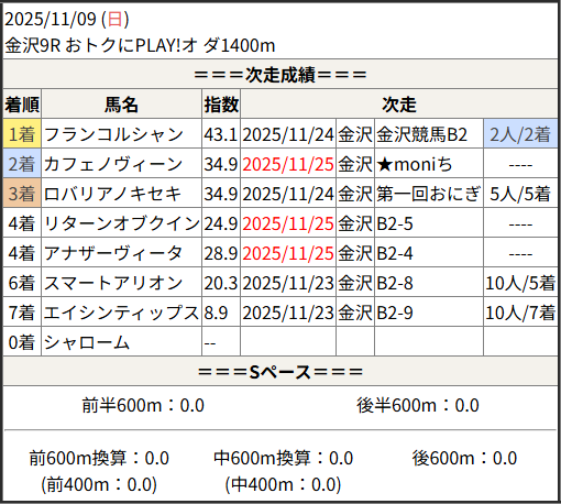 2025/11/25 金沢9R ★moniちゃん誕生:結果