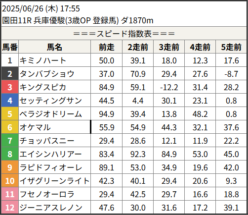 Home / 予想データ / 2025/06/26 スピード指数表スピード指数予想データ2025/06/26 スピード指数表による shunrai コメントはまだありません2025年6月26日 00:00 ※見解・買い目はこちらを参照ください。 門別 浦和 名古屋 園田 佐賀 共有: クリックして X で共有 (新しいウィンドウで開きます) X クリックして友達にメールでリンクを送信 (新しいウィンドウで開きます) メールアドレス Facebook で共有するにはクリックしてください (新しいウィンドウで開きます) Facebook いいね:いいね 読み込み中…Share ArticlePrevious Article2025/6/25 さきたま杯 単勝◎注☆ 14,280円Next Article2025/06/26 次走好走馬の目立つ組出身shunraiRelated Posts 2025/11/15 スピード指数表 2025年11月14日 2025/11/14 スピード指数表 2025年11月13日 2025/11/13 スピード指数表 2025年11月12日コメントを残す コメントをキャンセルメールアドレスが公開されることはありません。 ※ が付いている欄は必須項目ですコメント名前 メール サイト 次回のコメントで使用するためブラウザーに自分の名前、メールアドレス、サイトを保存する。 Δ