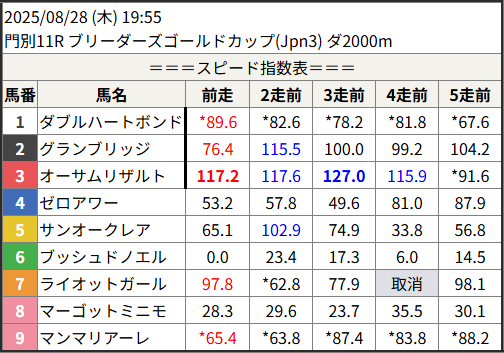 Home / 予想データ / 2025/08/28 スピード指数表スピード指数予想データ2025/08/28 スピード指数表による shunrai コメントはまだありません2025年8月28日 00:23 ※見解・買い目はこちらを参照ください。 門別 船橋 笠松 園田 共有: クリックして X で共有 (新しいウィンドウで開きます) X クリックして友達にメールでリンクを送信 (新しいウィンドウで開きます) メールアドレス Facebook で共有するにはクリックしてください (新しいウィンドウで開きます) Facebook いいね:いいね 読み込み中…Share ArticlePrevious Article2025/08/27 次走好走馬の目立つ組出身Next Article2025/08/29 スピード指数表shunraiRelated Posts 2025/11/15 スピード指数表 2025年11月14日 2025/11/14 スピード指数表 2025年11月13日 2025/11/13 スピード指数表 2025年11月12日コメントを残す コメントをキャンセルメールアドレスが公開されることはありません。 ※ が付いている欄は必須項目ですコメント名前 メール サイト 次回のコメントで使用するためブラウザーに自分の名前、メールアドレス、サイトを保存する。 Δ