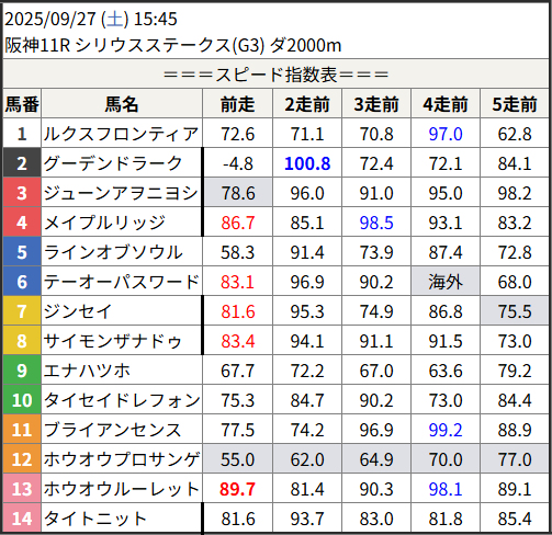 Home / 予想データ / 2025/09/27 スピード指数表スピード指数予想データ2025/09/27 スピード指数表による shunrai コメントはまだありません2025年9月26日 15:07 ※見解・買い目はこちらを参照ください。 中山 阪神 高知 佐賀 共有: クリックして X で共有 (新しいウィンドウで開きます) X クリックして友達にメールでリンクを送信 (新しいウィンドウで開きます) メールアドレス Facebook で共有するにはクリックしてください (新しいウィンドウで開きます) Facebook いいね:いいね 読み込み中…Share ArticlePrevious Article2025/9/26 笠松6R 3連単◎○△ 9,700円🎯Next Article2025/9/26 園田5R 3連単◎○▲ 28,950円🎯shunraiRelated Posts 2025/11/15 スピード指数表 2025年11月14日 2025/11/14 スピード指数表 2025年11月13日 2025/11/13 スピード指数表 2025年11月12日コメントを残す コメントをキャンセルメールアドレスが公開されることはありません。 ※ が付いている欄は必須項目ですコメント名前 メール サイト 次回のコメントで使用するためブラウザーに自分の名前、メールアドレス、サイトを保存する。 Δ