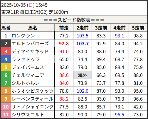 Home / 予想データ / 2025/10/05 スピード指数表スピード指数予想データ2025/10/05 スピード指数表による shunrai コメントはまだありません2025年10月4日 18:44 ※見解・買い目はこちらを参照ください。 東京 京都 水沢 大井 高知 佐賀 共有: クリックして X で共有 (新しいウィンドウで開きます) X クリックして友達にメールでリンクを送信 (新しいウィンドウで開きます) メールアドレス Facebook で共有するにはクリックしてください (新しいウィンドウで開きます) Facebook いいね:いいね 読み込み中…Share ArticlePrevious Article2025/10/04 次走好走馬の目立つ組出身Next Article2025/10/4 京都12R 馬連◎○ 34,400円🎯shunraiRelated Posts 2025/11/15 スピード指数表 2025年11月14日 2025/11/14 スピード指数表 2025年11月13日 2025/11/13 スピード指数表 2025年11月12日コメントを残す コメントをキャンセルメールアドレスが公開されることはありません。 ※ が付いている欄は必須項目ですコメント名前 メール サイト 次回のコメントで使用するためブラウザーに自分の名前、メールアドレス、サイトを保存する。 Δ