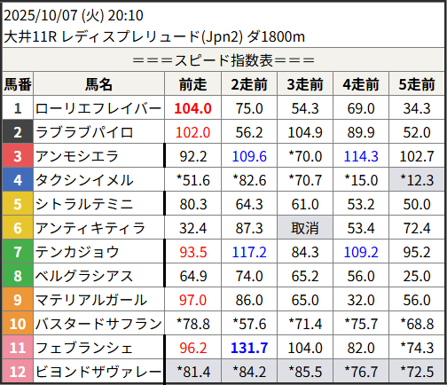 Home / 予想データ / 2025/10/07 スピード指数表スピード指数予想データ2025/10/07 スピード指数表による shunrai コメントはまだありません2025年10月6日 18:29 ※見解・買い目はこちらを参照ください。 門別 水沢 大井 金沢 笠松 共有: クリックして X で共有 (新しいウィンドウで開きます) X クリックして友達にメールでリンクを送信 (新しいウィンドウで開きます) メールアドレス Facebook で共有するにはクリックしてください (新しいウィンドウで開きます) Facebook いいね:いいね 読み込み中…Share ArticlePrevious Article2025/10/6 金沢3R 3連単◎○△ 35,750円🎯Next Article2025/10/07 次走好走馬の目立つ組出身shunraiRelated Posts 2025/11/15 スピード指数表 2025年11月14日 2025/11/14 スピード指数表 2025年11月13日 2025/11/13 スピード指数表 2025年11月12日コメントを残す コメントをキャンセルメールアドレスが公開されることはありません。 ※ が付いている欄は必須項目ですコメント名前 メール サイト 次回のコメントで使用するためブラウザーに自分の名前、メールアドレス、サイトを保存する。 Δ