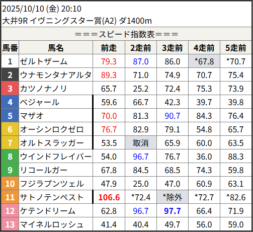 Home / 予想データ / 2025/10/10 スピード指数表スピード指数予想データ2025/10/10 スピード指数表による shunrai コメントはまだありません2025年10月9日 18:29 ※見解・買い目はこちらを参照ください。 大井 笠松 園田 共有: クリックして X で共有 (新しいウィンドウで開きます) X クリックして友達にメールでリンクを送信 (新しいウィンドウで開きます) メールアドレス Facebook で共有するにはクリックしてください (新しいウィンドウで開きます) Facebook いいね:いいね 読み込み中…Share ArticlePrevious Article2025/10/09 次走好走馬の目立つ組出身Next Article2025/10/9 大井3R 3連単○☆◎ 19,520円🎯shunraiRelated Posts 2025/11/15 スピード指数表 2025年11月14日 2025/11/14 スピード指数表 2025年11月13日 2025/11/13 スピード指数表 2025年11月12日コメントを残す コメントをキャンセルメールアドレスが公開されることはありません。 ※ が付いている欄は必須項目ですコメント名前 メール サイト 次回のコメントで使用するためブラウザーに自分の名前、メールアドレス、サイトを保存する。 Δ