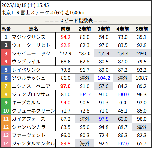 Home / 予想データ / 2025/10/18 スピード指数表スピード指数予想データ2025/10/18 スピード指数表による shunrai コメントはまだありません2025年10月17日 18:53 ※見解・買い目はこちらを参照ください。 新潟 東京 京都 高知 佐賀 共有: クリックして X で共有 (新しいウィンドウで開きます) X クリックして友達にメールでリンクを送信 (新しいウィンドウで開きます) メールアドレス Facebook で共有するにはクリックしてください (新しいウィンドウで開きます) Facebook いいね:いいね 読み込み中…Share ArticlePrevious Article2025/10/17 園田8R 3連単○注▲ 11,230円🎯Next Article2025/10/18 京都9R ワイド○◎ 10,800円🎯shunraiRelated Posts 2025/11/15 スピード指数表 2025年11月14日 2025/11/14 スピード指数表 2025年11月13日 2025/11/13 スピード指数表 2025年11月12日コメントを残す コメントをキャンセルメールアドレスが公開されることはありません。 ※ が付いている欄は必須項目ですコメント名前 メール サイト 次回のコメントで使用するためブラウザーに自分の名前、メールアドレス、サイトを保存する。 Δ