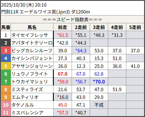 Home / 予想データ / 2025/10/30 スピード指数表スピード指数予想データ2025/10/30 スピード指数表による shunrai コメントはまだありません2025年10月29日 18:46 ※見解・買い目はこちらを参照ください。 門別 浦和 名古屋 園田 共有: クリックして X で共有 (新しいウィンドウで開きます) X クリックして友達にメールでリンクを送信 (新しいウィンドウで開きます) メールアドレス Facebook で共有するにはクリックしてください (新しいウィンドウで開きます) Facebook いいね:いいね 読み込み中…Share ArticlePrevious Article2025/10/29 次走好走馬の目立つ組出身Next Article2025/10/30 次走好走馬の目立つ組出身shunraiRelated Posts 2025/11/15 スピード指数表 2025年11月14日 2025/11/14 スピード指数表 2025年11月13日 2025/11/13 スピード指数表 2025年11月12日コメントを残す コメントをキャンセルメールアドレスが公開されることはありません。 ※ が付いている欄は必須項目ですコメント名前 メール サイト 次回のコメントで使用するためブラウザーに自分の名前、メールアドレス、サイトを保存する。 Δ