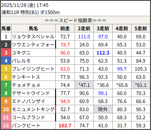 Home / 予想データ / 2025/11/28 スピード指数表スピード指数予想データ2025/11/28 スピード指数表による shunrai コメントはまだありません2025年11月27日 19:38 ※見解・買い目はこちらを参照ください。 浦和 笠松 共有: クリックして X で共有 (新しいウィンドウで開きます) X クリックして友達にメールでリンクを送信 (新しいウィンドウで開きます) メールアドレス Facebook で共有するにはクリックしてください (新しいウィンドウで開きます) Facebook いいね:いいね 読み込み中…Share ArticlePrevious Article2025/11/27 笠松4R 3連単◎△○ 17,900円🎯Next Article2025/11/28 次走好走馬の目立つ組出身shunraiRelated Posts 2025/12/29 スピード指数表 2025年12月28日 2025/12/28 スピード指数表 2025年12月27日 2025/12/27 スピード指数表 2025年12月26日コメントを残す コメントをキャンセルメールアドレスが公開されることはありません。 ※ が付いている欄は必須項目ですコメント名前 メール サイト 次回のコメントで使用するためブラウザーに自分の名前、メールアドレス、サイトを保存する。 Δ