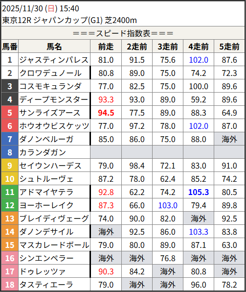 Home / 予想データ / 2025/11/30 スピード指数表スピード指数予想データ2025/11/30 スピード指数表による shunrai コメントはまだありません2025年11月29日 18:34 ※見解・買い目はこちらを参照ください。 東京 京都 水沢 高知 佐賀 共有: クリックして X で共有 (新しいウィンドウで開きます) X クリックして友達にメールでリンクを送信 (新しいウィンドウで開きます) メールアドレス Facebook で共有するにはクリックしてください (新しいウィンドウで開きます) Facebook いいね:いいね 読み込み中…Share ArticlePrevious Article2025/11/29 京都10R 馬連・ワイド・3連単○◎▲ 54,830円🎯Next Article2025/11/30 次走好走馬の目立つ組出身shunraiRelated Posts 2025/12/29 スピード指数表 2025年12月28日 2025/12/28 スピード指数表 2025年12月27日 2025/12/27 スピード指数表 2025年12月26日コメントを残す コメントをキャンセルメールアドレスが公開されることはありません。 ※ が付いている欄は必須項目ですコメント名前 メール サイト 次回のコメントで使用するためブラウザーに自分の名前、メールアドレス、サイトを保存する。 Δ