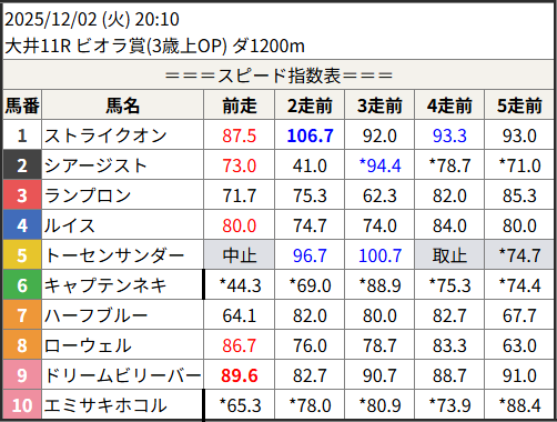 Home / 予想データ / 2025/12/02 スピード指数表スピード指数予想データ2025/12/02 スピード指数表による shunrai コメントはまだありません2025年12月1日 18:38 ※見解・買い目はこちらを参照ください。 水沢 大井 金沢 園田 共有: クリックして X で共有 (新しいウィンドウで開きます) X クリックして友達にメールでリンクを送信 (新しいウィンドウで開きます) メールアドレス Facebook で共有するにはクリックしてください (新しいウィンドウで開きます) Facebook いいね:いいね 読み込み中…Share ArticlePrevious Article2025/12/01 水沢10R 馬連・3連複 17,000円🎯Next Article2025/12/01 大井12R 馬連・ワイド○◎ 43,000円🎯shunraiRelated Posts 2025/12/29 スピード指数表 2025年12月28日 2025/12/28 スピード指数表 2025年12月27日 2025/12/27 スピード指数表 2025年12月26日コメントを残す コメントをキャンセルメールアドレスが公開されることはありません。 ※ が付いている欄は必須項目ですコメント名前 メール サイト 次回のコメントで使用するためブラウザーに自分の名前、メールアドレス、サイトを保存する。 Δ