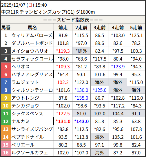 Home / 予想データ / 2025/12/07 スピード指数表スピード指数予想データ2025/12/07 スピード指数表による shunrai コメントはまだありません2025年12月6日 19:06 ※見解・買い目はこちらを参照ください。 中山 中京 阪神 金沢 高知 佐賀 共有: クリックして X で共有 (新しいウィンドウで開きます) X クリックして友達にメールでリンクを送信 (新しいウィンドウで開きます) メールアドレス Facebook で共有するにはクリックしてください (新しいウィンドウで開きます) Facebook いいね:いいね 読み込み中…Share ArticlePrevious Article2025/12/06 次走好走馬の目立つ組出身Next Article2025/12/08 スピード指数表shunraiRelated Posts 2025/12/29 スピード指数表 2025年12月28日 2025/12/28 スピード指数表 2025年12月27日 2025/12/27 スピード指数表 2025年12月26日コメントを残す コメントをキャンセルメールアドレスが公開されることはありません。 ※ が付いている欄は必須項目ですコメント名前 メール サイト 次回のコメントで使用するためブラウザーに自分の名前、メールアドレス、サイトを保存する。 Δ
