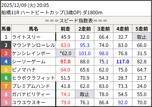 Home / 予想データ / 2025/12/09 スピード指数表スピード指数予想データ2025/12/09 スピード指数表による shunrai コメントはまだありません2025年12月8日 20:52 ※見解・買い目はこちらを参照ください。 水沢 船橋 金沢 名古屋 園田 共有: クリックして X で共有 (新しいウィンドウで開きます) X クリックして友達にメールでリンクを送信 (新しいウィンドウで開きます) メールアドレス Facebook で共有するにはクリックしてください (新しいウィンドウで開きます) Facebook いいね:いいね 読み込み中…Share ArticlePrevious Article2025/12/08 次走好走馬の目立つ組出身Next Article2025/12/09 次走好走馬の目立つ組出身shunraiRelated Posts 2025/12/29 スピード指数表 2025年12月28日 2025/12/28 スピード指数表 2025年12月27日 2025/12/27 スピード指数表 2025年12月26日コメントを残す コメントをキャンセルメールアドレスが公開されることはありません。 ※ が付いている欄は必須項目ですコメント名前 メール サイト 次回のコメントで使用するためブラウザーに自分の名前、メールアドレス、サイトを保存する。 Δ