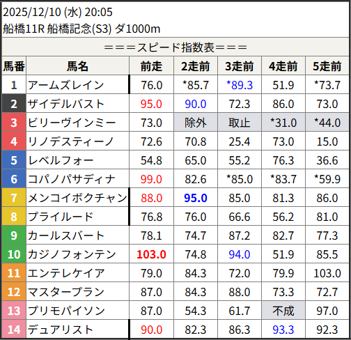 Home / 予想データ / 2025/12/10 スピード指数表スピード指数予想データ2025/12/10 スピード指数表による shunrai コメントはまだありません2025年12月9日 19:12 ※見解・買い目はこちらを参照ください。 水沢 船橋 名古屋 園田 共有: クリックして X で共有 (新しいウィンドウで開きます) X クリックして友達にメールでリンクを送信 (新しいウィンドウで開きます) メールアドレス Facebook で共有するにはクリックしてください (新しいウィンドウで開きます) Facebook いいね:いいね 読み込み中…Share ArticlePrevious Article2025/12/09 次走好走馬の目立つ組出身Next Article2025/12/10 次走好走馬の目立つ組出身shunraiRelated Posts 2025/12/29 スピード指数表 2025年12月28日 2025/12/28 スピード指数表 2025年12月27日 2025/12/27 スピード指数表 2025年12月26日コメントを残す コメントをキャンセルメールアドレスが公開されることはありません。 ※ が付いている欄は必須項目ですコメント名前 メール サイト 次回のコメントで使用するためブラウザーに自分の名前、メールアドレス、サイトを保存する。 Δ