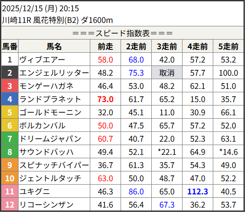Home / 予想データ / 2025/12/15 スピード指数表スピード指数予想データ2025/12/15 スピード指数表による shunrai コメントはまだありません2025年12月14日 21:15 ※見解・買い目はこちらを参照ください。 水沢 川崎 金沢 共有: クリックして X で共有 (新しいウィンドウで開きます) X クリックして友達にメールでリンクを送信 (新しいウィンドウで開きます) メールアドレス Facebook で共有するにはクリックしてください (新しいウィンドウで開きます) Facebook いいね:いいね 読み込み中…Share ArticlePrevious Article2025/12/14 スピード指数表Next Article2025/12/16 スピード指数表shunraiRelated Posts 2025/12/29 スピード指数表 2025年12月28日 2025/12/28 スピード指数表 2025年12月27日 2025/12/27 スピード指数表 2025年12月26日コメントを残す コメントをキャンセルメールアドレスが公開されることはありません。 ※ が付いている欄は必須項目ですコメント名前 メール サイト 次回のコメントで使用するためブラウザーに自分の名前、メールアドレス、サイトを保存する。 Δ