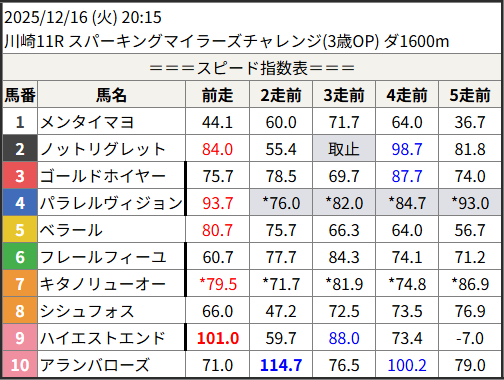 Home / 予想データ / 2025/12/16 スピード指数表スピード指数予想データ2025/12/16 スピード指数表による shunrai コメントはまだありません2025年12月16日 04:47 ※見解・買い目はこちらを参照ください。 水沢 川崎 金沢 笠松 園田 共有: クリックして X で共有 (新しいウィンドウで開きます) X クリックして友達にメールでリンクを送信 (新しいウィンドウで開きます) メールアドレス Facebook で共有するにはクリックしてください (新しいウィンドウで開きます) Facebook いいね:いいね 読み込み中…Share ArticlePrevious Article2025/12/15 スピード指数表Next Article2025/12/16 次走好走馬の目立つ組出身shunraiRelated Posts 2025/12/29 スピード指数表 2025年12月28日 2025/12/28 スピード指数表 2025年12月27日 2025/12/27 スピード指数表 2025年12月26日コメントを残す コメントをキャンセルメールアドレスが公開されることはありません。 ※ が付いている欄は必須項目ですコメント名前 メール サイト 次回のコメントで使用するためブラウザーに自分の名前、メールアドレス、サイトを保存する。 Δ