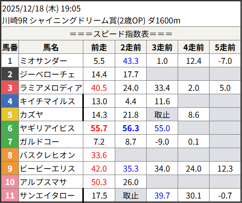 Home / 予想データ / 2025/12/18 スピード指数表スピード指数予想データ2025/12/18 スピード指数表による shunrai コメントはまだありません2025年12月17日 20:51 ※見解・買い目はこちらを参照ください。 川崎 名古屋 園田 共有: クリックして X で共有 (新しいウィンドウで開きます) X クリックして友達にメールでリンクを送信 (新しいウィンドウで開きます) メールアドレス Facebook で共有するにはクリックしてください (新しいウィンドウで開きます) Facebook いいね:いいね 読み込み中…Share ArticlePrevious Article2025/12/17 次走好走馬の目立つ組出身Next Article2025/12/18 次走好走馬の目立つ組出身shunraiRelated Posts 2025/12/29 スピード指数表 2025年12月28日 2025/12/28 スピード指数表 2025年12月27日 2025/12/27 スピード指数表 2025年12月26日コメントを残す コメントをキャンセルメールアドレスが公開されることはありません。 ※ が付いている欄は必須項目ですコメント名前 メール サイト 次回のコメントで使用するためブラウザーに自分の名前、メールアドレス、サイトを保存する。 Δ