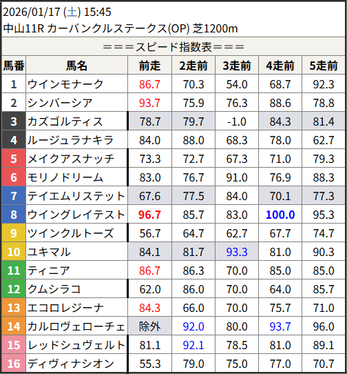 Home / 予想データ / 2026/01/17 スピード指数表スピード指数予想データ2026/01/17 スピード指数表による shunrai コメントはまだありません2026年1月16日 18:49 ※見解・買い目はこちらを参照ください。 中山 京都 佐賀 共有: X で共有 (新しいウィンドウで開きます) X 友達にメールでリンクを送信 (新しいウィンドウで開きます) メールアドレス Facebook で共有 (新しいウィンドウで開きます) Facebook いいね:いいね 読み込み中…Share ArticlePrevious Article2026/01/16 大井11R 馬連・ワイド・3連単◎○▲ 15,650円🎯Next Article2026/01/16 名古屋12R 3連単◎○▲ 71,840円🎯shunraiRelated Posts 2026/02/13 スピード指数表 2026年2月12日 2026/02/12 スピード指数表 2026年2月12日 2026/02/11 スピード指数表 2026年2月11日コメントを残す コメントをキャンセルメールアドレスが公開されることはありません。 ※ が付いている欄は必須項目ですコメント名前 メール サイト 次回のコメントで使用するためブラウザーに自分の名前、メールアドレス、サイトを保存する。 Δ