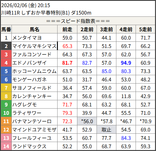 Home / 予想データ / 2026/02/06 スピード指数表スピード指数予想データ2026/02/06 スピード指数表による shunrai コメントはまだありません2026年2月5日 18:34 ※見解・買い目はこちらを参照ください。 川崎 笠松 共有: クリックして X で共有 (新しいウィンドウで開きます) X クリックして友達にメールでリンクを送信 (新しいウィンドウで開きます) メールアドレス Facebook で共有するにはクリックしてください (新しいウィンドウで開きます) Facebook いいね:いいね 読み込み中…Share ArticlePrevious Article2026/02/05 次走好走馬の目立つ組出身shunraiRelated Posts 2026/02/05 スピード指数表 2026年2月4日 2026/02/04 スピード指数表 2026年2月3日 2026/02/03 スピード指数表 2026年2月2日コメントを残す コメントをキャンセルメールアドレスが公開されることはありません。 ※ が付いている欄は必須項目ですコメント名前 メール サイト 次回のコメントで使用するためブラウザーに自分の名前、メールアドレス、サイトを保存する。 Δ