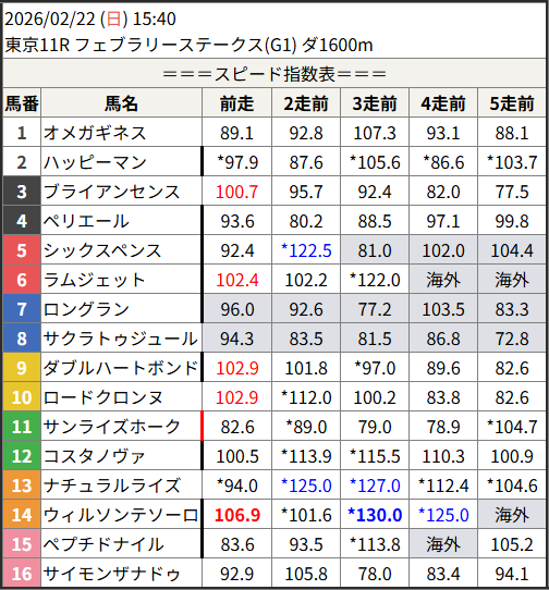 Home / 予想データ / 2026/02/22 スピード指数表スピード指数予想データ2026/02/22 スピード指数表による shunrai コメントはまだありません2026年2月21日 17:44 ※見解・買い目はこちらを参照ください。 東京 阪神 小倉 高知 佐賀 共有: X で共有 (新しいウィンドウで開きます) X 友達にメールでリンクを送信 (新しいウィンドウで開きます) メールアドレス Facebook で共有 (新しいウィンドウで開きます) Facebook いいね:いいね 読み込み中…Share ArticlePrevious Article2026/02/21 スピード指数表shunraiRelated Posts 2026/02/21 スピード指数表 2026年2月20日 2026/02/20 スピード指数表 2026年2月19日 2026/02/19 スピード指数表 2026年2月18日コメントを残す コメントをキャンセルメールアドレスが公開されることはありません。 ※ が付いている欄は必須項目ですコメント名前 メール サイト 次回のコメントで使用するためブラウザーに自分の名前、メールアドレス、サイトを保存する。 Δ